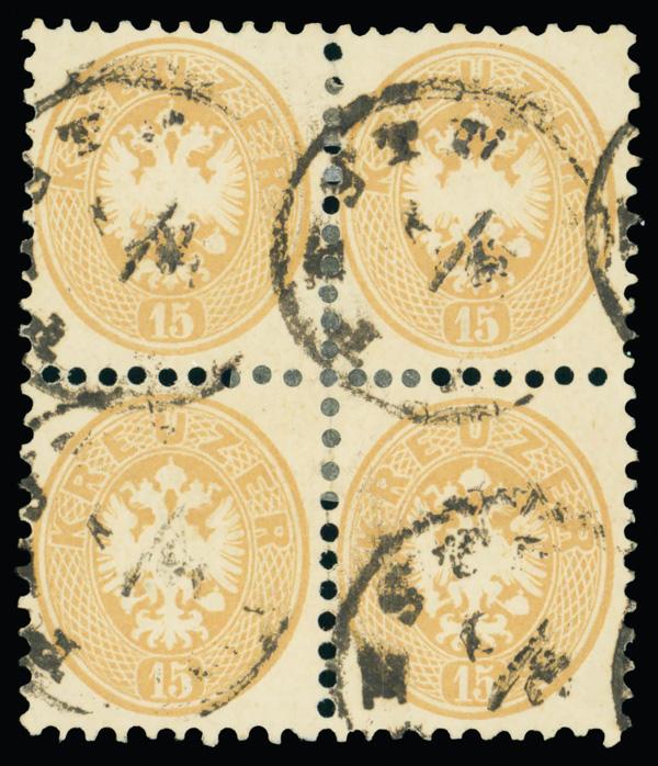 1863, Double Eagle, 15kr brown, perf. 14 (Scott 21), block of 4, Hungarian postmark, Fine to Very Fine. Michel 28 a; €1,000 ($1,080). (Image)