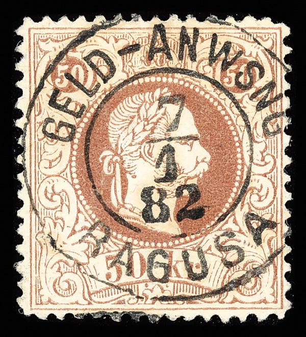 1867, 50kr Franz Josef, cancels study (Scott 33 vars.), trio with socked-on-the-nose/maximal cancels, comprising Michel #41 Ia with 1875 Vienna "Geld Anwsng Franz Josefs Quai" double-ring, 41 Ib with oval Registry cancel, and 41 II with 1882 "Geld-Anwsng/Ragusa" double-ring; stamps sound and offering a mix of shades, the cancels as nice as you'll find, Very Fine. Michel 41 Ia, Ib, II. Scott $390 as cheapest shade. (Image)