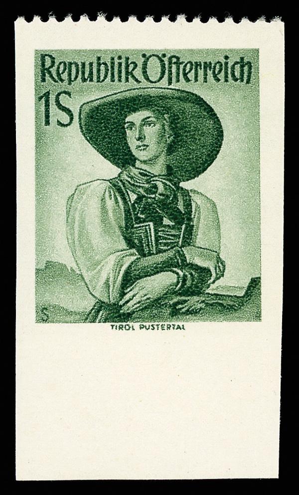 1951, Austrian Costumes, 1S dark green (Scott 539 var.), o.g., never hinged, perforated only at top, pristine with wide, balanced margins, Very Fine. Michel 912 Udr; €300 ($320). (Image)