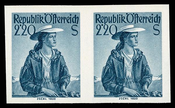 1952, Austrian Costumes, 2.20S gray blue, imperforate (Scott 547 var.), horizontal pair, o.g., never hinged, fresh and cleanly printed on white paper with flat gum; sound with full margins, Very Fine. Michel 978 II yb U; €600 ($650). (Image)