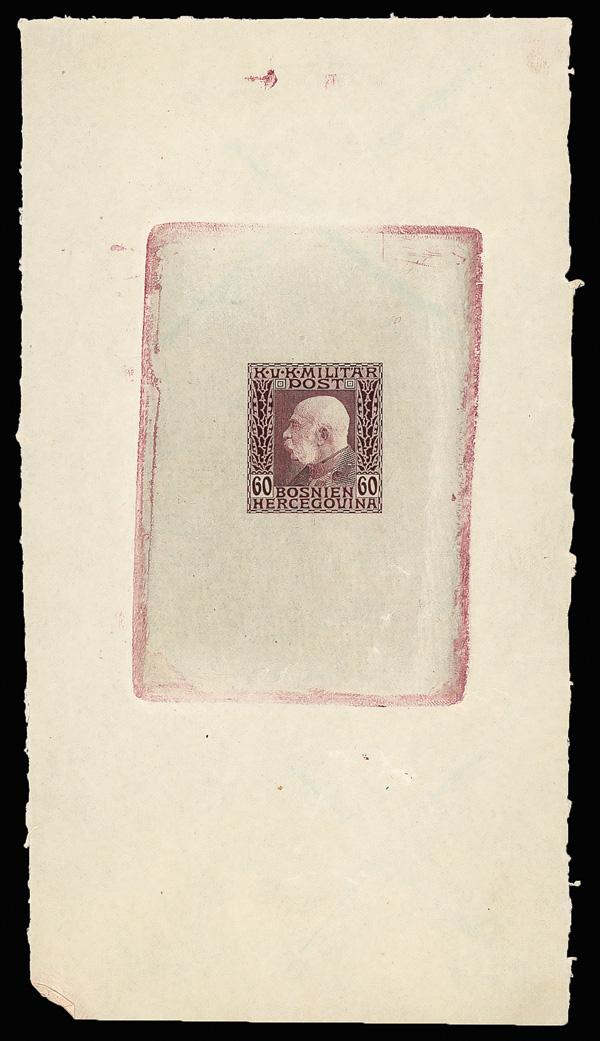 1912, 50h & 60h Franz Josef, large die proofs (Scott 78-79), on yellowish wove in issued colors; die sinkage measures approximately 56x79mm on paper 90x165mm; impressions bold and clean, the paper with light corner faults of no real consequence, still Very Fine. Michel 77 P U-78 P U; €400 ($430). (Image)