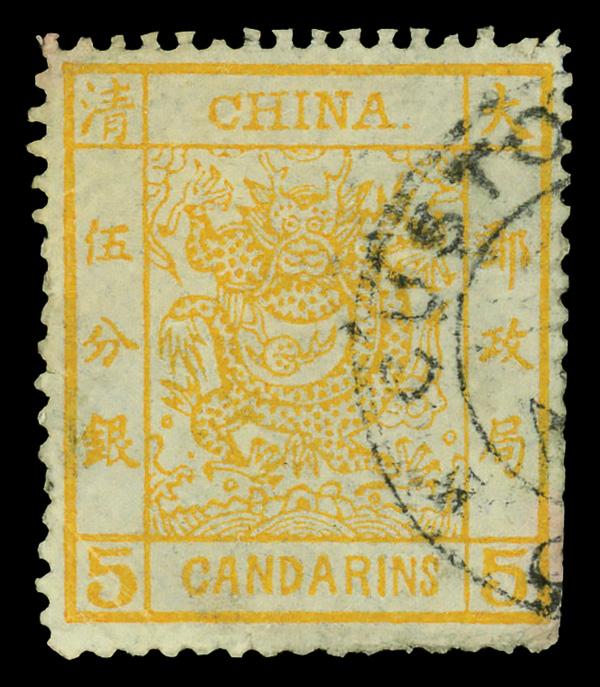 1878, Large Dragon on thin paper, 5ca orange (Scott 3), single, Fine, clipped perfs bottom and bottom right, small tears on left side small creases. Chan 3. Scott $600. (Image)