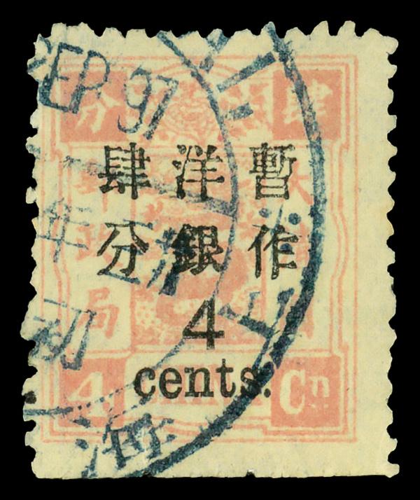 1897, Large Figures narrow surcharge on Dowager, 2nd printing, 4¢ on 4ca pale rose (Scott 68), single; Pulled and trimmed perfs, Fine to Very Fine, Trimmed perfs bottom. Chan 77. Scott $225. (Image)