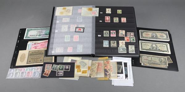 Cuba, Stamps and Currency Collection, 1864-1958, like new Lighthouse stockbook with mint and postally used Cuba, Colonial and up to the Revolution; 4 colonial era Cuban notes and two dozen Cuban notes from 1940-1972 timeframe; two dozen Eastern Communist notes and a handful of vintage Spanish notes; Hitler head definitives 1pf-5RM on stock card; and a few dozen WW in glassines; interesting, Fine. Shipping charges apply - weight 3 lbs. (Video for this lot) (Image)