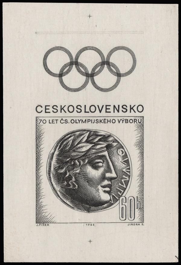 1966 Olympic Committee Anniversary, 60h Die proof of black only on thin card (Scott 1415P), 36x53 mm, Very Fine. (Image)