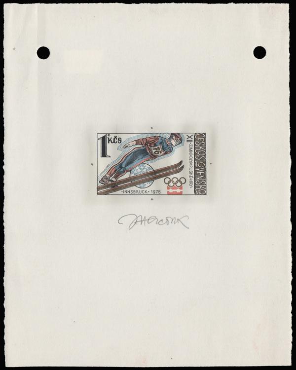 1976 Innsbruck Olympics, 1k Ski Jump, Signed Artist's Proof (Scott 2054P), 105x135 mm with two punched filing holes, Very Fine. (Image)