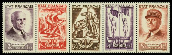 1943, Marshall Pétain complete (Scott B157a), strip of 5, o.g., never hinged, Extremely Fine. Yvert 580A. Scott $100. (Image)