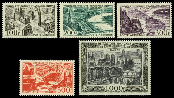 Airmail, 1947, City Views, 100fr to 1,000fr complete (Scott C23-C27), set of 5, o.g., never hinged, Extremely Fine. Yvert 24-27,29. Scott $213. (Image)