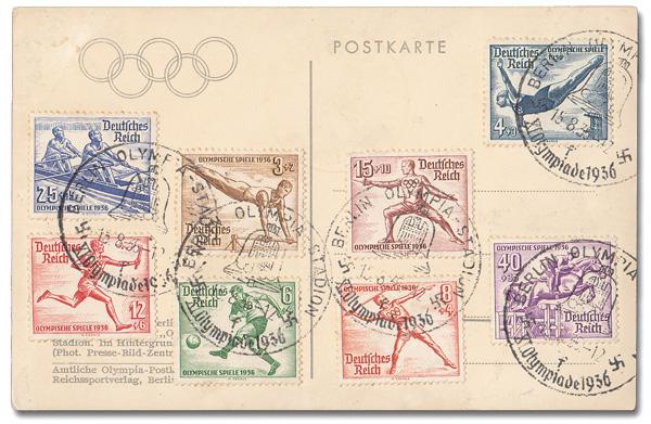 1936 Summer Olympics (Scott B82-B89), the complete set tied by Olympic Stadium cancels, 15 Aug 1936, on an Olympic picture postcard featuring a real photo of the Opening Ceremonies. Michel 609-616. (Image)