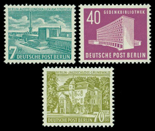 1954 Buildings complete (Scott 9N108-9N110), set of 3, o.g., never hinged, Very Fine. Michel 121-123. Scott $100. (Image)