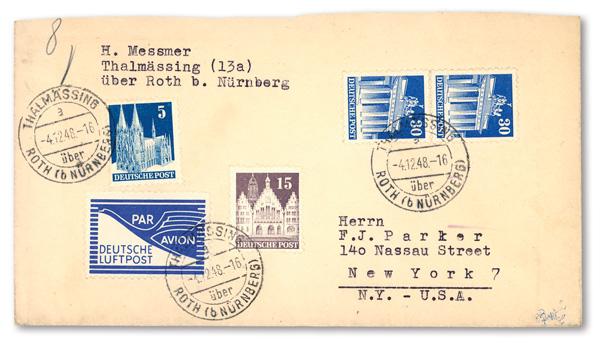 1948, 5pf, 15pf & 30pf Buildings (Scott 636, 643, 649), on Airmail cover with blue-and-white etiquette, from Thalmässing to Nassau Street, New York City, all tied by Dec. 4, 1948 postmarks; sent during the time of the Berlin Airlift; opened slightly unevenly at top but otherwise a clean example, Fine to Very Fine, signed Poppel. (Image)