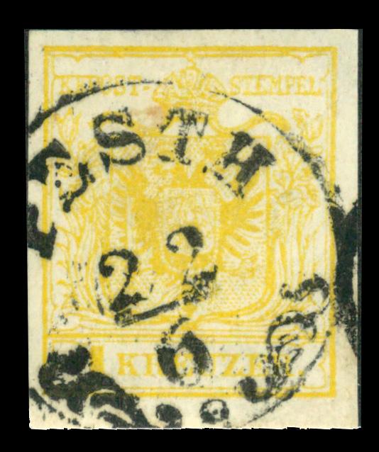 1850, Coat of Arms, 1kr yellow, hand-made paper (Scott 1), single, Fine to Very Fine, nice 4 margin copy. Michel 1 X a. Scott $115. (Image)