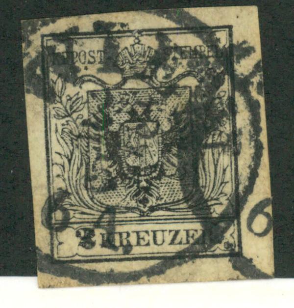 1854, Coat of Arms, 2kr black, machine-made paper (Scott 2c), single, Fine to Very Fine, nice 4 margin copy. Michel 2 Y a. Scott $83. (Image)