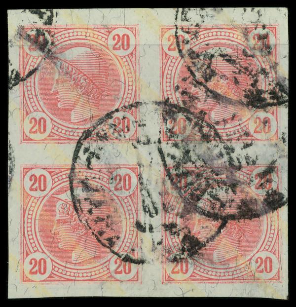 Newspaper Stamp, 1901, Mercury, 20(h) rose, with varnish bars (Scott P14a), block of 4, scarce block, Very Fine to Extremely Fine. Michel 104. Scott $260. (Image)