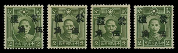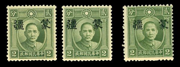 1941, 2c green overprinted varieties type A,B,C (Scott 2N1), singles, o.g., some never hinged / some hinged, Fine to Very Fine. Ma NC204-NC206. Scott $8. (Image)