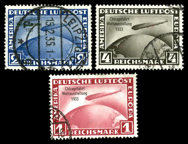 1933, Graf Zeppelin flight to Century of Progress complete (Scott C43-C45), complete set of singles, Fine to Very Fine. Scott $755. (Image)