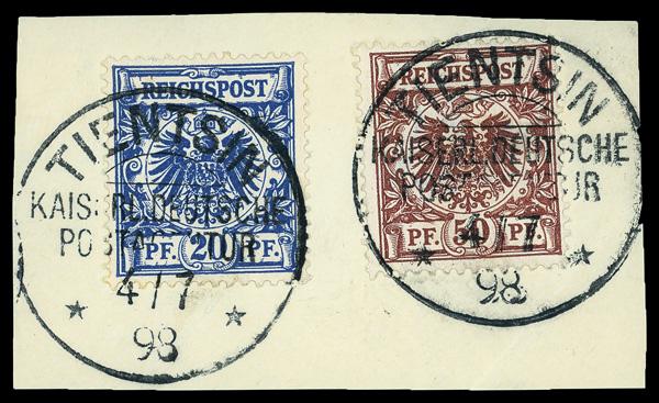 1890, 50pf Eagle & Crown, bright reddish brown, alongside 20pf violet ultramarine (Michel #M48 d); an early Concurrent use (starting June 1898), each tied by clean "Tientsin/Kaiserl. Deutsche/Postagentur" postmark of July 4, 1898, a pristine piece, the stamps sound, Very Fine, signed W. Engel. Michel M50 d; €450 ($490). (Image)