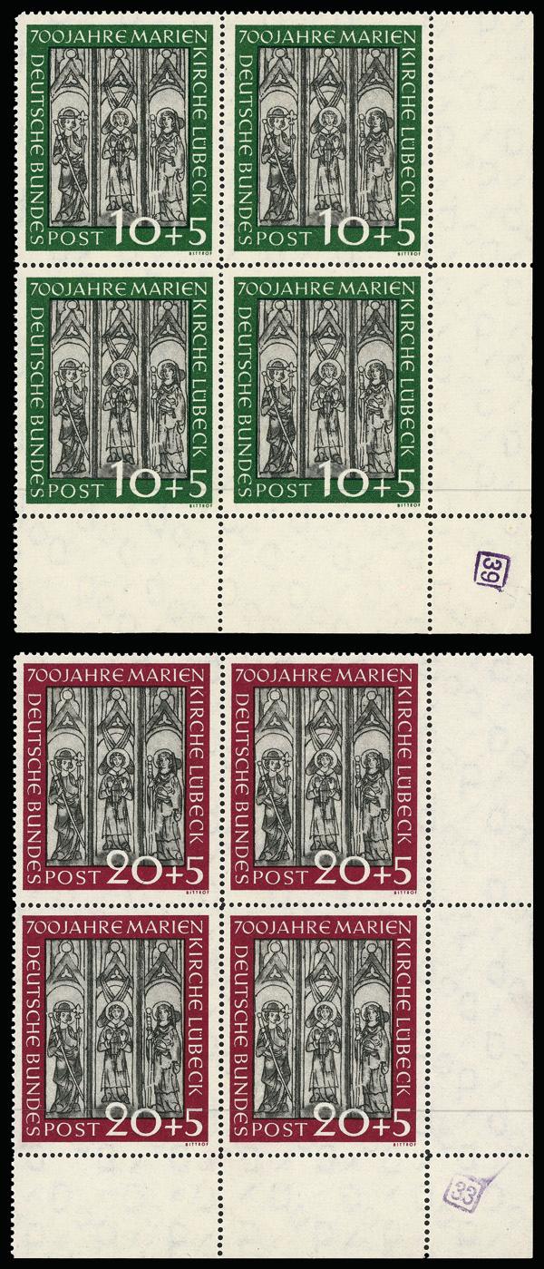 1951 Marienkirche complete (Scott B316-B317), set of 2, corner margin block of 4, o.g., never hinged, Extremely Fine. Michel 139-140. Scott $680. (Image)