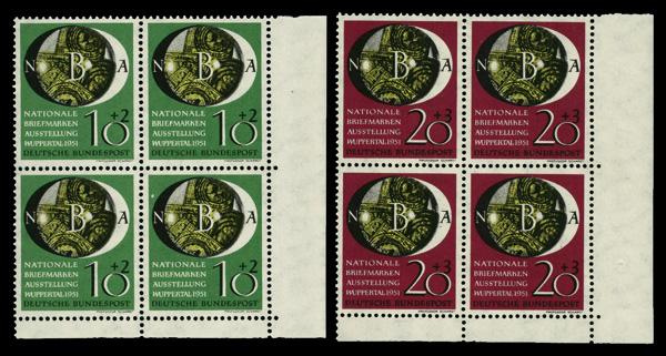 1951 Wuppertal complete (Scott B318-B319), corner margin blocks of 4, o.g., never hinged, Very Fine to Extremely Fine. Michel 141-142. Scott $270. (Image)