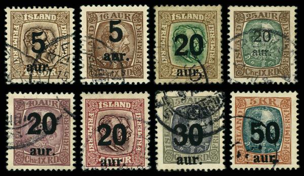 1921-25, surcharges on King Christian IX and Two Kings, 5a to 50a complete (Scott 130-138), set of 8, Very Fine. Michel 104//113. Facit 98//106. Scott $191. (Image)