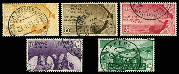 Airmail, 1935, Bellini Issue, complete set (Scott C79-C83), certificate for #C83 with questionable cancel, Fine to Very Fine, with 2024 A.P.E.X. certificate for #C83. Scott $622. (Image)