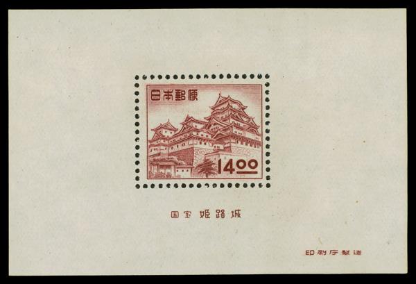 1951, 1st National Treasures Series, 14y Himeji Castle, miniature sheet of 1 (Scott 517a), miniature sheet of 1, o.g., never hinged, Fine to Very Fine. J.S.C.A. 349. Scott $80. (Image)