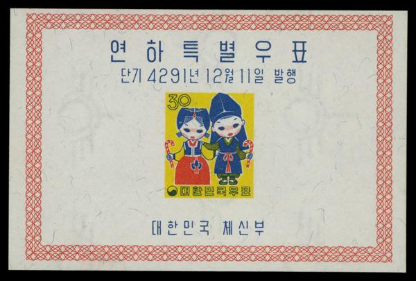 1958, 30h yellow, ultramarine & red Children in Costume (Scott 289a), souvenir sheet of 1, o.g., never hinged, Fine to Very Fine. Scott $68. (Image)
