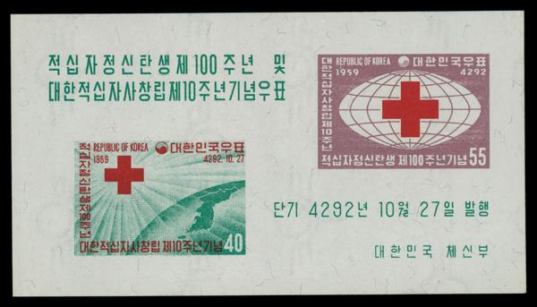 1959, Red Cross and Korea Map (Scott 296a), souvenir sheet of 2, o.g., never hinged, Fine to Very Fine. Scott $38. (Image)