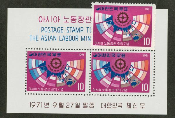 1971, Asian Labor Ministers Conference in Seoul (Scott 797-797a), single and souvenir sheet of 2, o.g., never hinged, Fine to Very Fine. Scott $46. (Image)