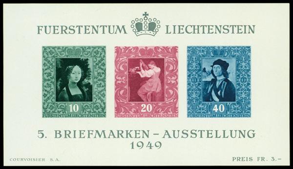 1949, 5th Philatelic Exhibition souvenir sheet of 3 (Scott 238), o.g., never hinged, Extremely Fine. Michel Block 5. Zumstein 23. Scott $110. (Image)