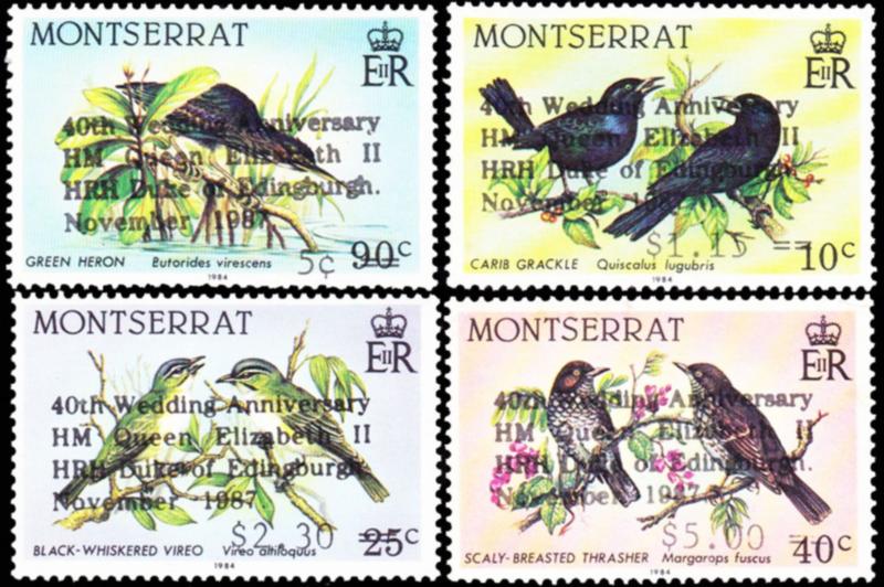1987 Scott 663-666 90c Green Heron Overprinted 5c, 10c Carib Grackle Overprinted $1.15, 25c Black-Whiskered Vireo Overprinted $2.30 and 40c Scaly-Breasted Thrasher Overprinted $5.00 All Overprinted 40th Wedding Anniversary HM QEII and HRH Duke of Edingburgh November 1947. ( Inv #: MNT0663S1) (Image)