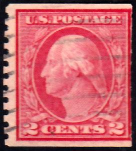 1916 Scott 453 2c Washington Franklin Coil Type I. Used perforations cut off by stamp affixing machine. ( Inv #: USA0453S01) (Image)