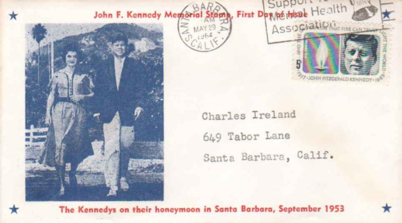 1963 Scott 1246 5c Kennedy Memorial 1963 Santa Barbara, Calif. Illustrated Support Your Mental Health Association Slogan. Local Use. Unofficial City First Day. Unlisted Unknown cachet. Typewritten Address. ( Inv #: USA1246C21) (Image)