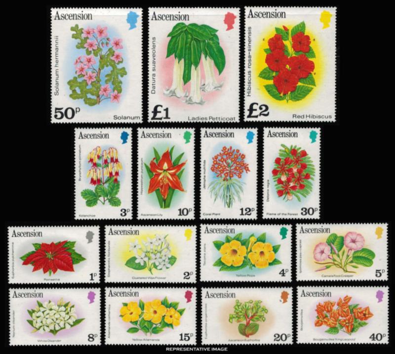 1981 Scott 274-288 1p, 2p, 3p, 4p, 5p, 8p, 10p, 12p, 15p, 20p, 30p, 40p, 50p, £1 and £2 Flowers. Mint never hinged. ( Inv #: ASC0274S2) (Image)