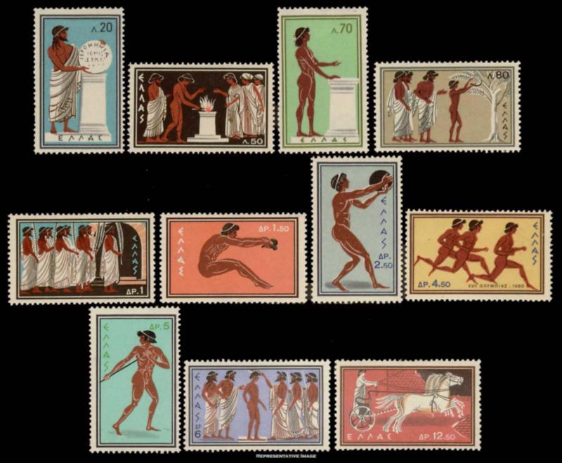 1960 Scott 677-687 20l, 50l, 70l, 80l, 1D, 1.50D, 2.50D, 4.50D, 5D, 6D and 12.50D 1960 Olympic Games. Mint never hinged. ( Inv #: GRC0677S4) (Image)