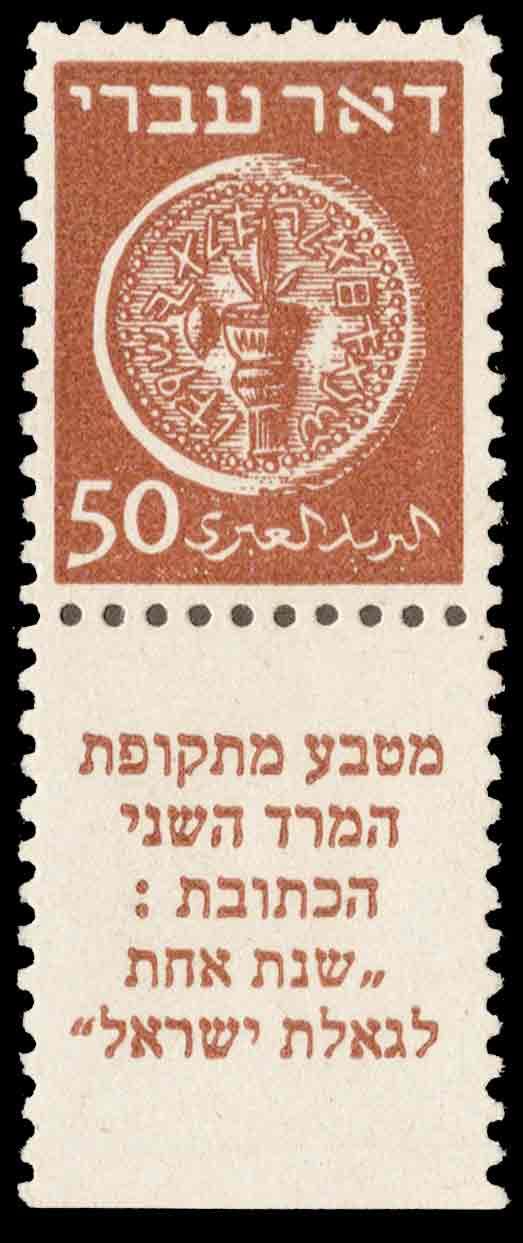 1948 Scott 6 50m Ancient Judean Coins with tab. Mint never hinged. ( Inv #: ISR0006S1) (Image)
