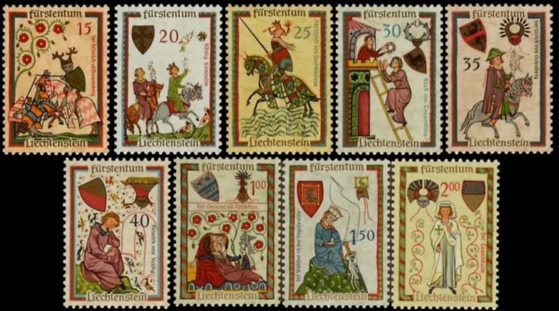 1961 Scott 359-367 15p Heinrich von Frauenberg, 20p King Konadin, 25p Ulrich von Liechtenstein, 30p Kraft von Tog Genburg, 35p Ulrich von Gutenberg, 40p Heinrich von Veldig, 1F Konrad von Alstetten, 1.5F Walther von der Vogelweide and 2F Tann Hauser. Mint never hinged. ( Inv #: LIE0359S2) (Image)