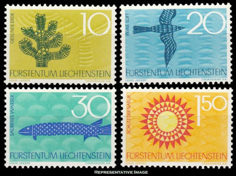 1966 Scott 406-409 10p Soil Conservation Tree, 20p Clean Air Bird, 30p Unpolluted Water Fish and 1.50F Nature Preservation Sun Sheets of 20. Mint never hinged. ( Inv #: LIE0406L01) (Image)