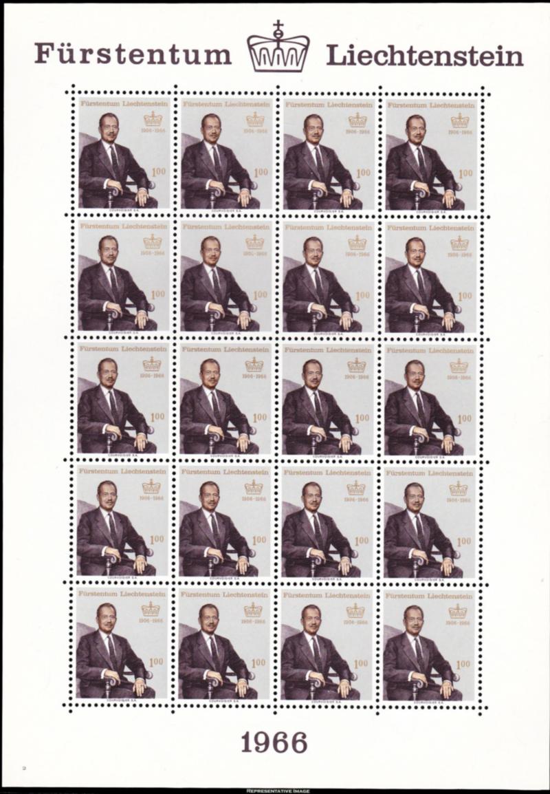 1966 Scott 410 1F Prince Franz Joseph II 60th Birthday Sheet of 20. Mint never hinged. ( Inv #: LIE0410L01) (Image)