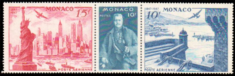 1947 Scott C20a 15f Statue of Liberty and New York Skyline, 10f Prince Louis II and 10f Harbor of Monte Carlo International Philatelic Exhibition S-tenant Strip of three. Mint never hinged. ( Inv #: MONC20aS1) (Image)