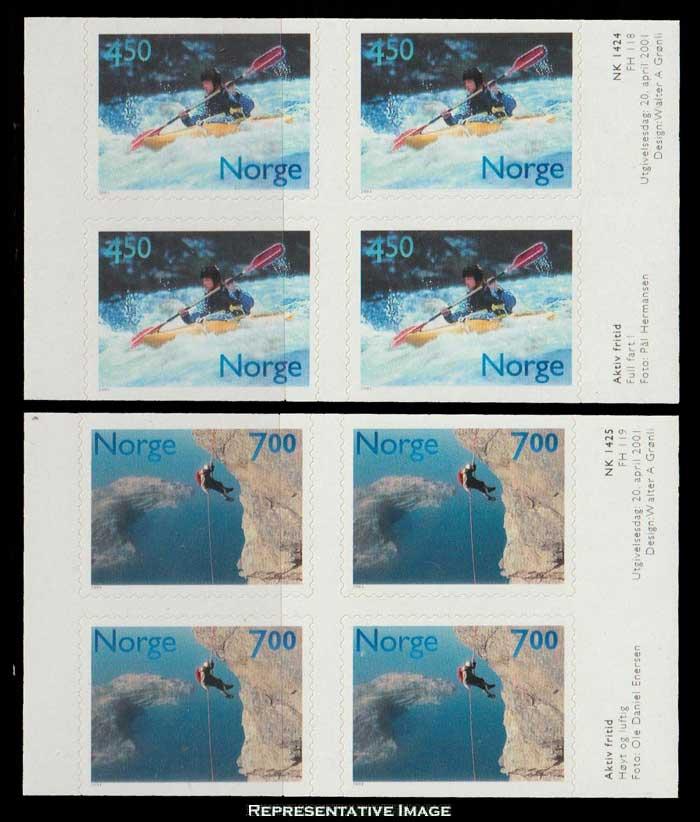2001 Scott 1294-1295 4.20K, 4.20K, 4.20K and 4.20K and 7K, 7K, 7K and 7K Adventure Sports Self-Adhesive Booklet Panes of four. Mint never hinged. ( Inv #: NOR1294S1) (Image)