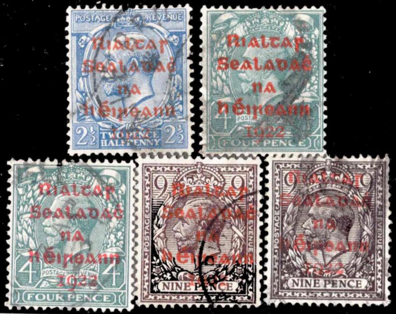 1922 Scott 9-11A Great Britain 2 1/2d, 4d in Red, 4d in Carmine, 9d in Red and 9d in Carmine KGV Overprinted Provisional Government of Ireland 1922. Used. ( Inv #: IRE0009S4) (Image)