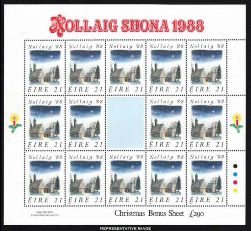 1988 Scott 730 21p, 21p, 21p, 21p, 21p, 21p, 21p, 21p, 21p, 21p, 21p, 21p, 21p and 21p St. Kevin's Church 1988 Christmas Sheet of forteenth with center label. Mint never hinged. ( Inv #: IRE0730L2) (Image)