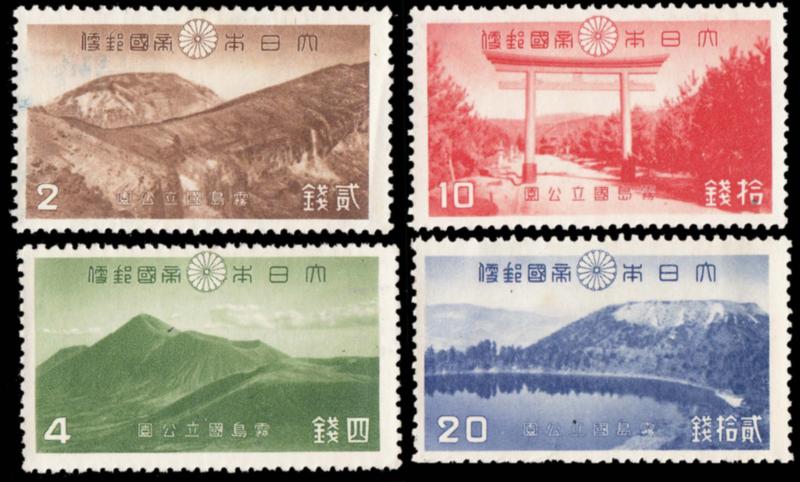 1940 Scott 308-311 2s Mount Karakuni, Kyushu, 4s Mount Takachiho, 10s Torii of Kirishima Shrine and 20s Lake of the Six Kwannon, Kirishima National Park. Unused hinged. ( Inv #: JAP0308S2) (Image)