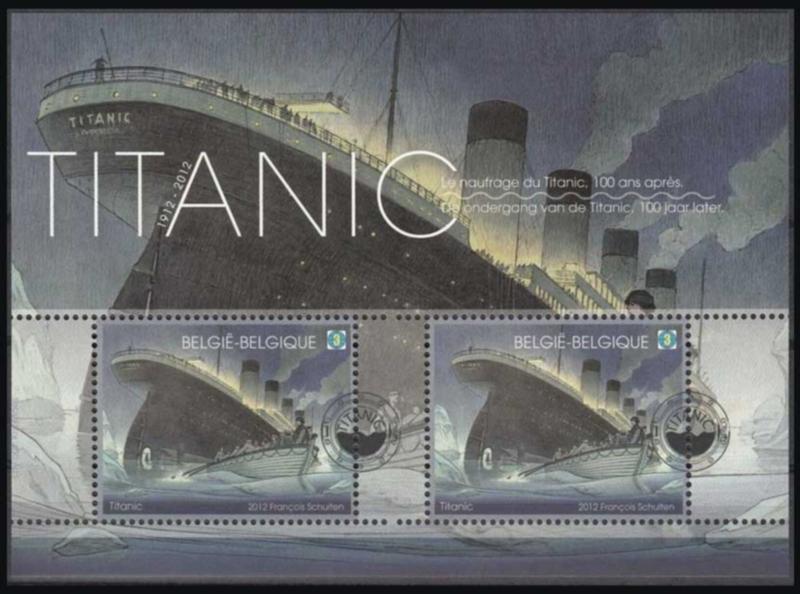 2012 Scott 2562 3 [€3.70] and 3 [€3.70] Sinking of the Titanic Souvenir Sheet of two with special cancel. Used. ( Inv #: BEL2562C2) (Image)
