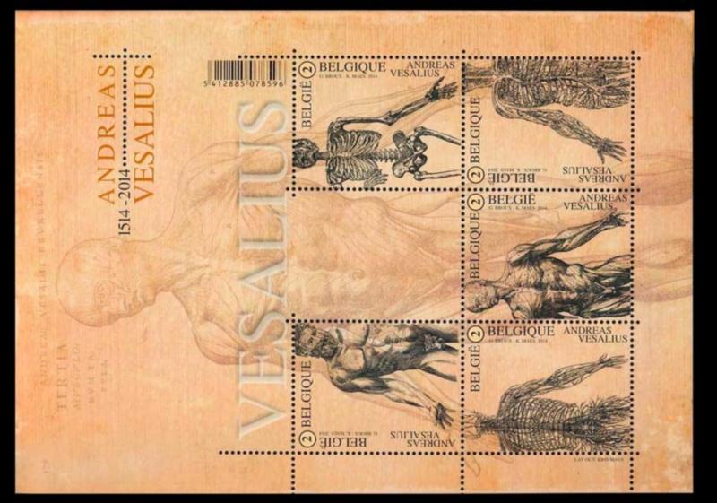 2014 Scott 2689 [€1.40], [€1.40], [€1.40], [€1.40] and [€1.40] Anatomical Drawings by Vesalius Se-tenant Minaiature Sheet. Mint never hinged. ( Inv #: BEL2689L1) (Image)