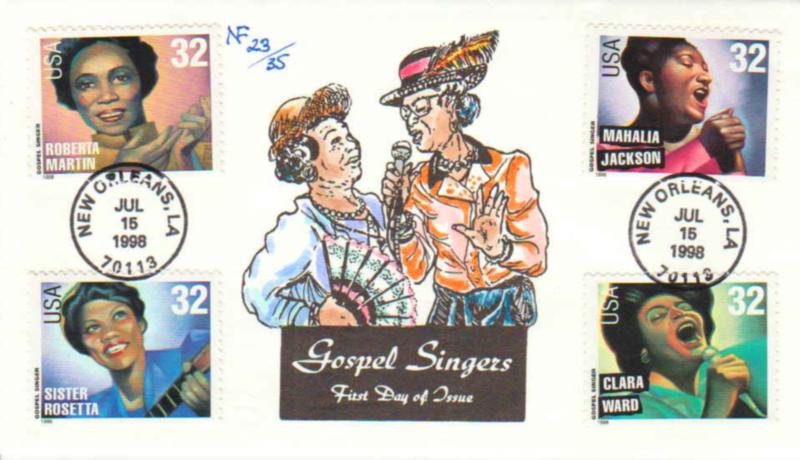 1998 Scott 3219a 32c Roberta Martin, 32c Mahalia Jackson, 32c Sister Rosetta and 32c Clara Ward Gospel Singers Se-tenant Block Singles 1998 New Orleans, LA 70113. First Day. Neil Faircloth Hand colored cachet #23 of 35. Unaddressed. ( Inv #: USA3219aC01) (Image)