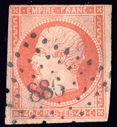 1853 Scott 18a 40c Orange Vermillion Yellowish Emperor Napoleon III with 866 [La Chapelle-en-Vercors] small numeral grid cancel. Used. ( Inv #: FRA0018aS1) (Image)
