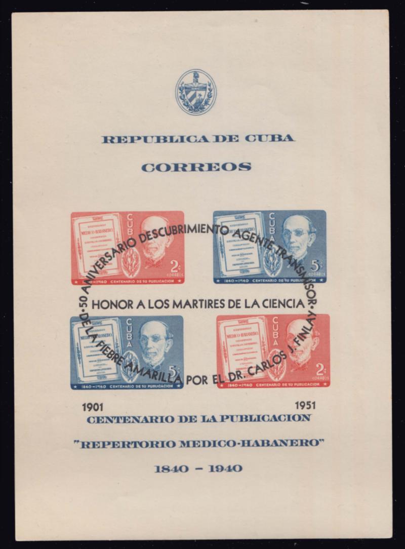 1955 Scott C43A 2c and 5c Dr. Gutierrez Souvenir Sheet Overprinted in Green Honoring Dr. Carlos J. Finlay Air Mail Souvenir Sheet 1955 Havana Exposion Filatelica. Mint never hinged. ( Inv #: CUBC043AL2) (Image)