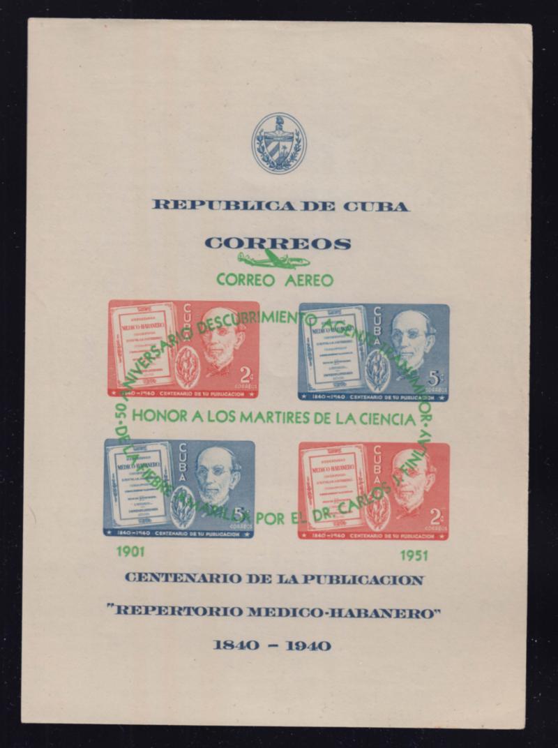 1955 Scott C43A 2c and 5c Dr. Gutierrez Souvenir Sheet Overprinted in Green Honoring Dr. Carlos J. Finlay Air Mail Souvenir Sheet 1955 Havana Explosion Filatelica. Mint never hinged. ( Inv #: CUBC043AL1) (Image)